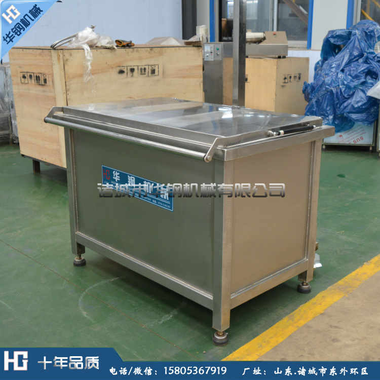 诸城华钢机械新款方形蒸煮锅,方形卤煮槽 自动提升卤煮锅以食品级304不锈钢制作,可满足不同客户的不同需求,尺寸可以根据产量要求定做,可分为电加热和蒸汽加热两种,设备可选配自动控温装置,有 效的控制锅内温度和蒸煮时间,配有内筐,产品放在内筐内蒸煮,卫生干净,方便操作,可自动通过提升装置把筐提起。锅外壁带有保温层,有 效的防止热量的散发,节约能源.锅底有手动阀门,可方便清理;适合大型卤煮肉制品,鸡产品等加工厂选用;