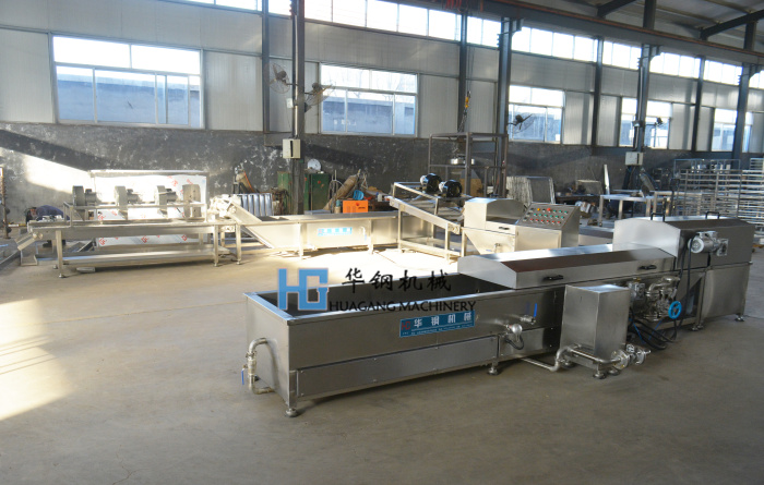 成型后的肉丸需在蒸煮槽的进一步蒸煮后通过旋转的拨板匀速地移动到蒸煮槽末端。不同品种肉丸蒸煮所需时间可通过调节拨板的转速来控制,使肉丸达到熟透状态。蒸煮槽内的丸子由链条传动到冷却槽内,肉丸须在冷却槽内迅速冷却,冷却槽内的水为开放型的,即进入冷水而溢出热水已达到冷却槽内水温始终在20度-25度左右。肉丸在冷却槽内冷却后可直接装盘进入速冻车间挂冰,或和速冻隧道(单冻机)连接。