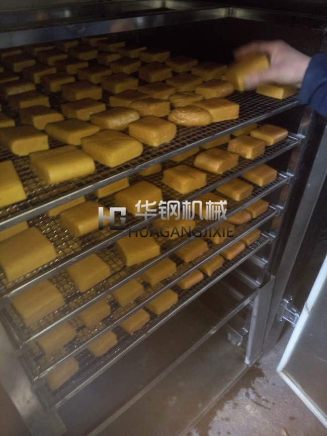 2.将放满豆腐干的推车推到烟熏炉里面。关上炉门,通过豆干烟熏炉左侧控制按钮或者PLC电脑控制面板,设定温度和时间,即可升温,表皮稍微烘干后打开发烟开关,烟雾即可在烟熏炉炉体内部烟熏豆腐干。烟熏时间到后自动报警,关闭发烟开关,打开排烟开关,将烟雾排到室外后,打开烟熏炉,即可看到烟熏完成的豆腐干。