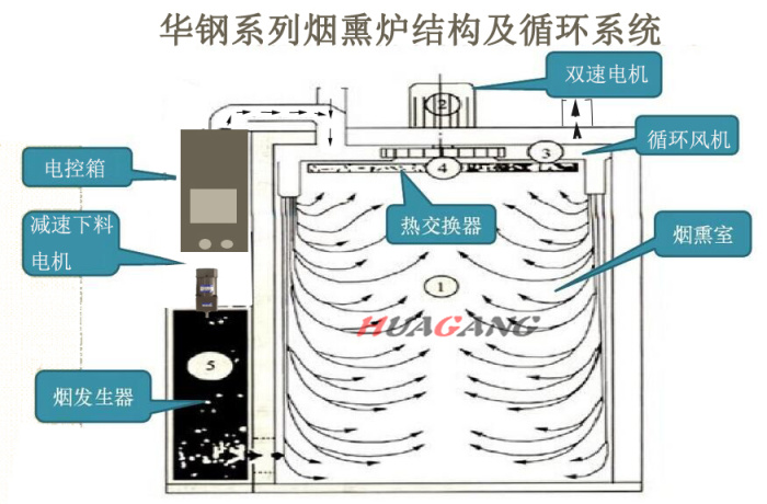 华钢系列烟熏炉干燥、蒸煮、烟熏三工序可按设定时间自动转换,温度按设定值自动调节,工序结束自动显示;主循环风扇送风均匀,使炉体内温度均匀,该机特别采用了双层不锈钢散热器,对炉温升温迅速,干燥效果好,而目前国内烟熏炉同关产品采用盘管式加热器,两者的升温效果是无法比拟的。采用设定参数方式,通用性广,自动运行中的参数可修正。