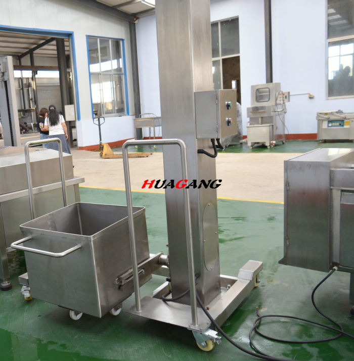 整机采用不锈钢材质,分为移动式和固定式两种机型,T200型提升机是专为200L标准肉车配套的提升设备,其功能是将物料提升到一定高度后,倾倒至设备的料斗中,以完成加料工作。该机采用全不锈钢材料制造,链条传动,便于清洗,美观耐用。具有运行平稳、安全可靠、易于清洁、操作方便等优点,采用进口双行程开关控制。工艺技术.