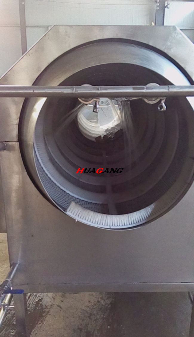 洗袋机内部用毛刷做成螺旋状,在清洗的过程中通过筒体的不断旋转,袋装食品也随着不断转动,与毛辊不断接触对包装表面的油污进行清洗,内部还加入了喷淋不断冲洗物料。而且清洗段分为两段清洗,前段可以针对产品加入一定的清洁剂以及消毒液之类的,后段进行二次清水清洗。设计更加合理与人性化。