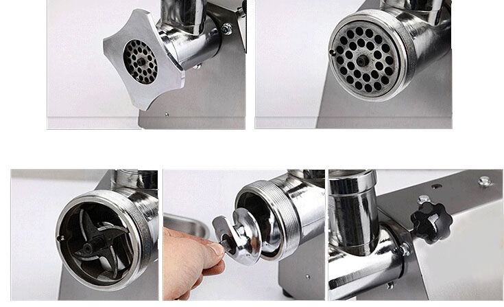 小型绞肉机工作原理主要靠旋转的螺杆交料斗中的原料肉推挤到绞刀箱中的预切孔板处,利用转动的切刀刃和孔板上孔眼刃形成的剪切作用将肉切碎,并在螺杆挤压力的作用下,将肉粒不断排出孔板处。这样,料斗中的肉不断通过螺杆进入绞刀箱,而肉靡断被排出机外。